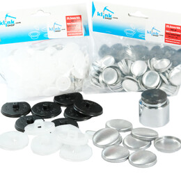 ÇEKİÇLE UYGULAMA APARATLI PAKET:Bir pakette100 takım 28 mm yani 44 Boy düğme ve uygulama aparatıvardır. Kumaş kaplamaya uygun alüminyum üst ve plastik alt parçalardan oluşur. Paket, kumaş içermez. Hazırladığınız kumaşlarınızı, sadece bir çekiç ile kolaylıkla düğmeye çevirmek için gerekli olan pratik aparatlar paket içerisindedir