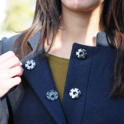 This product is suitable for use in dresses, coats, upper clothing, babywear, home textiles, and hobby products. It is applied by sewing by hand instead of punching onto the material.